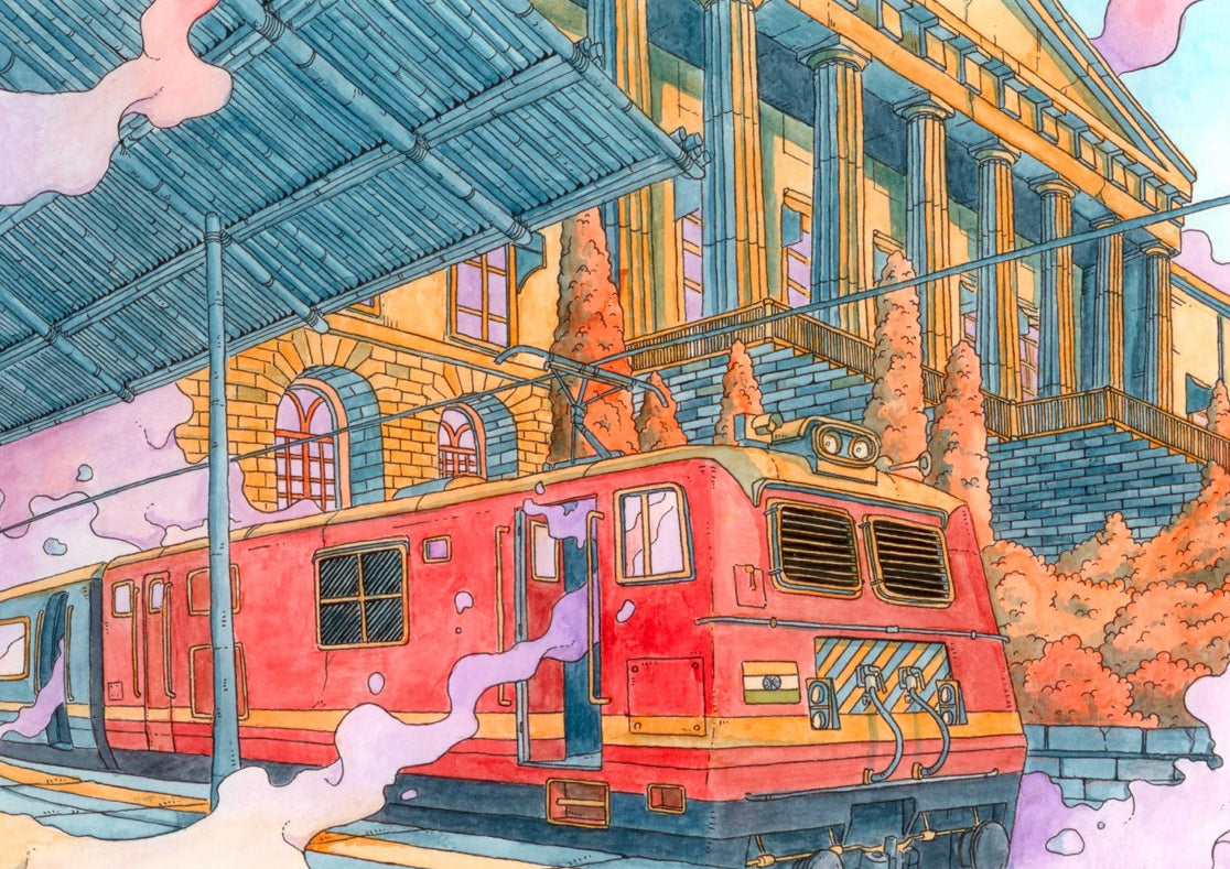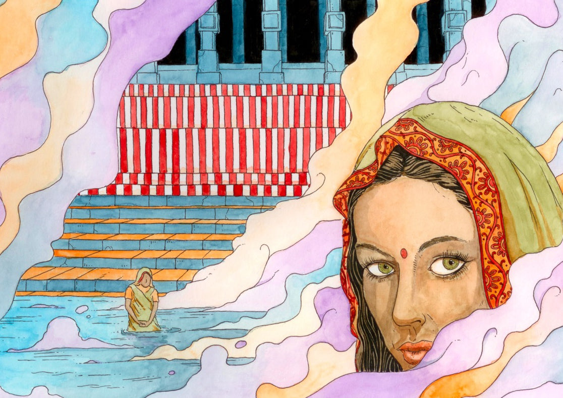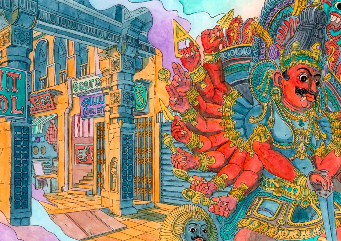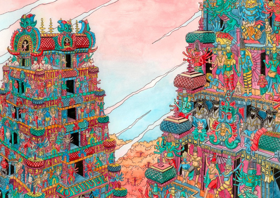 After graduating with a degree in graphic arts from the ERACOM School of Art and Communication in Lausanne in 2008, he went on to study visual communication, specialising in image and narrative, at the Geneva University of Art and Design (HEAD) in 2015. It was there that his passion for drawing and illustration blossomed, inspired by Hergé and Mœbius. He has used his keen sense of form and extreme attention to detail to bring the temples of Madurai to life, carried by the heady scent of bouquets of jasmine.