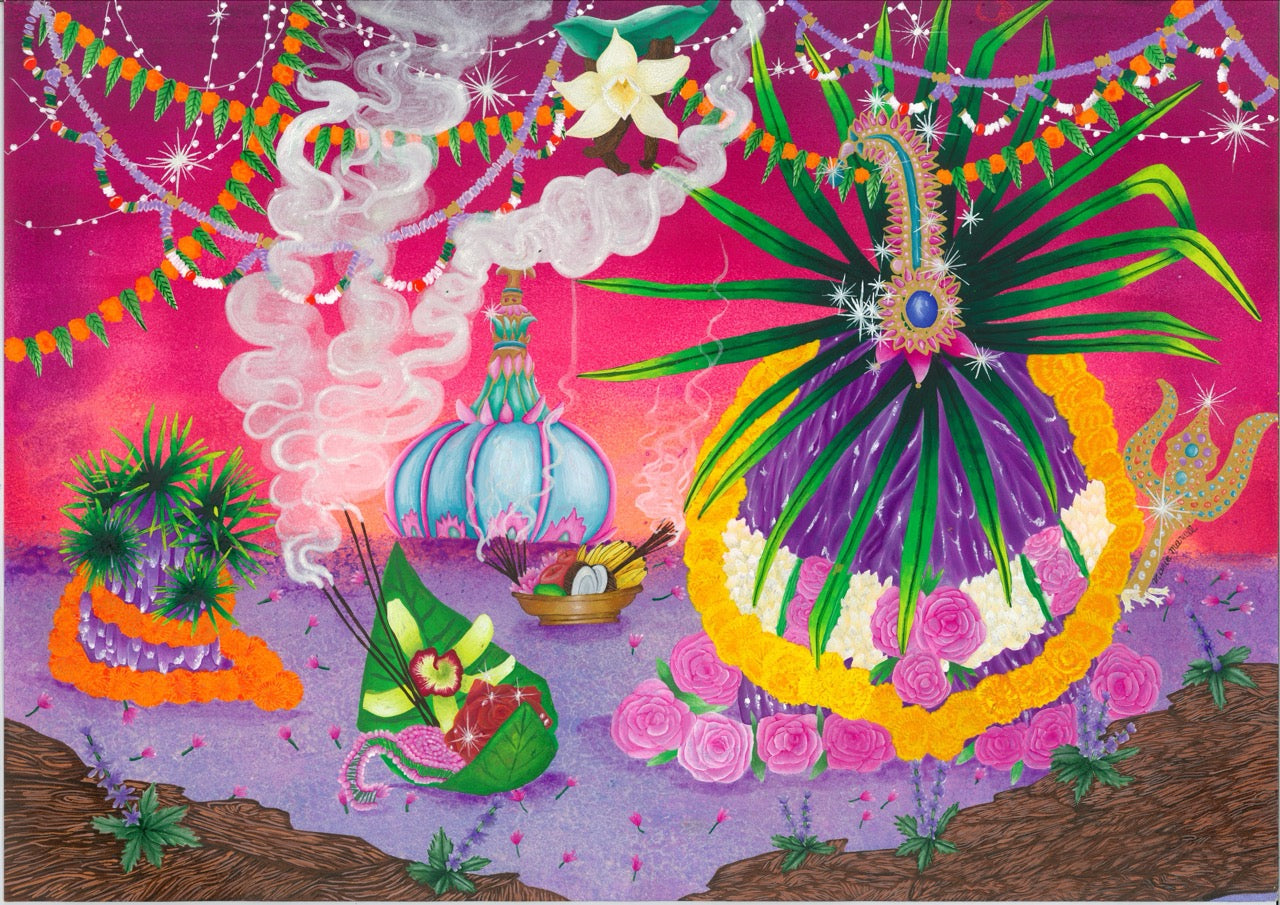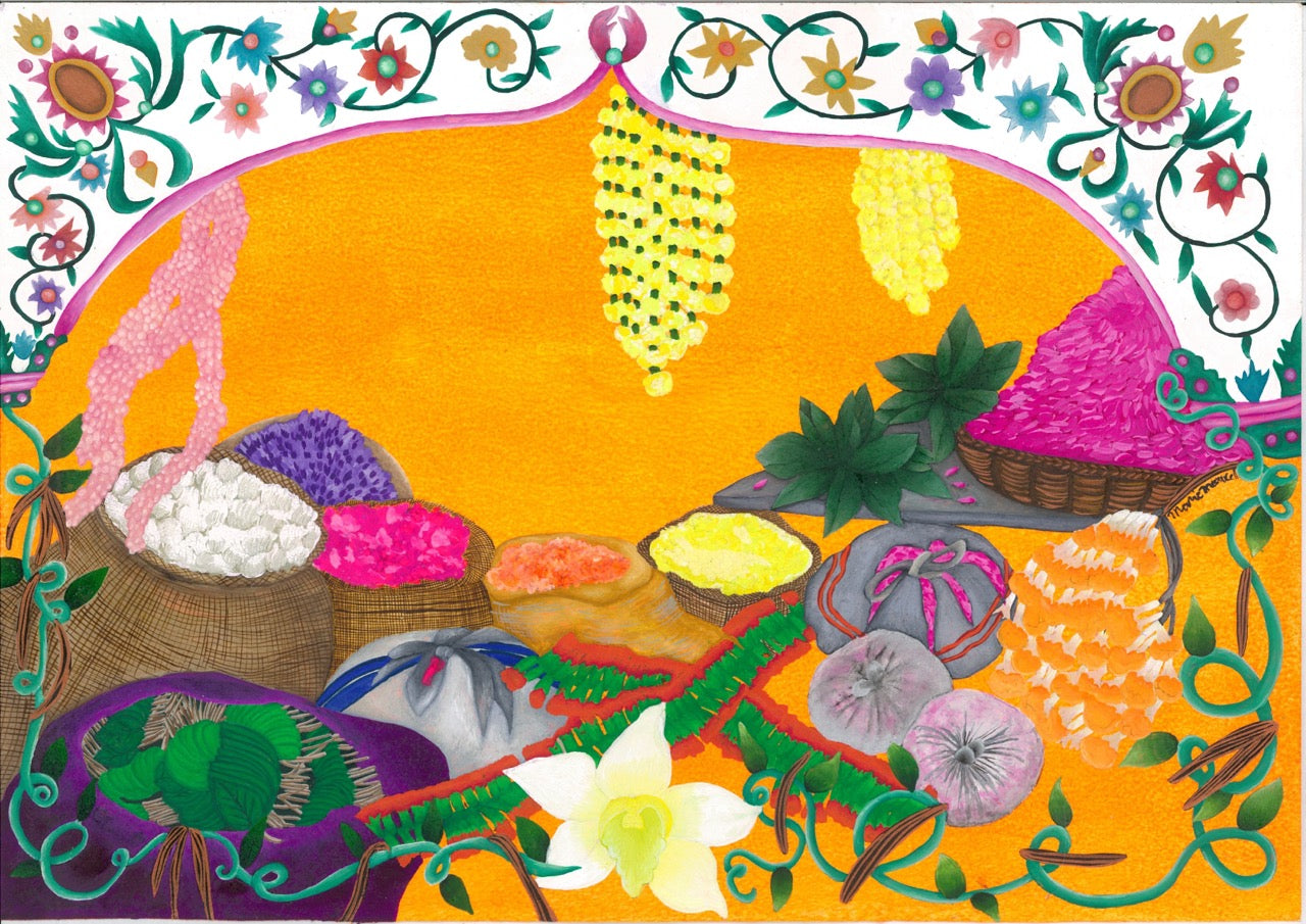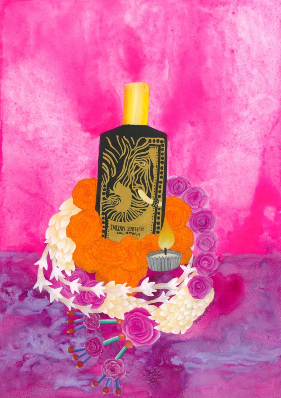 After graduating in design from the Rennes School of Fine Arts in 2015, she completed her training at the Duperré fashion school in Paris, began working alongside fashion designer Manish Arora in New Delhi, and then with jewellery designer Olivia Dar. She then decided to devote herself to painting and ceramics, drawing inspiration from her tropical childhood in Mayotte. For the Indian Leather fragrance, she delved back into her memories of India, focusing on the rendering of each design to create a rich, vibrant effect.
